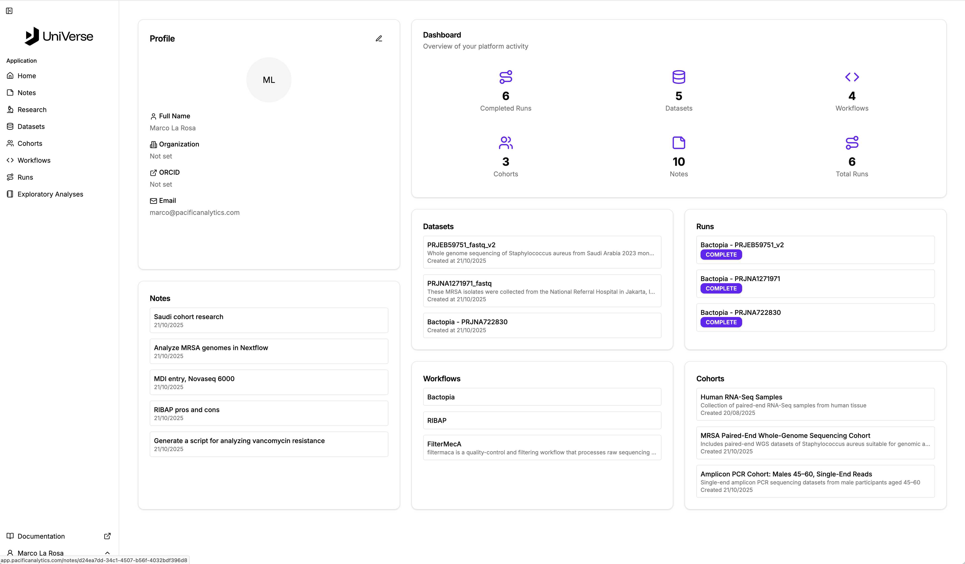 The remaining components are entrypoints to your recent notes, datasets. cohorts, workflows and runs. You can navigate directly each section by clicking the title or to a specific entry by selecting it.