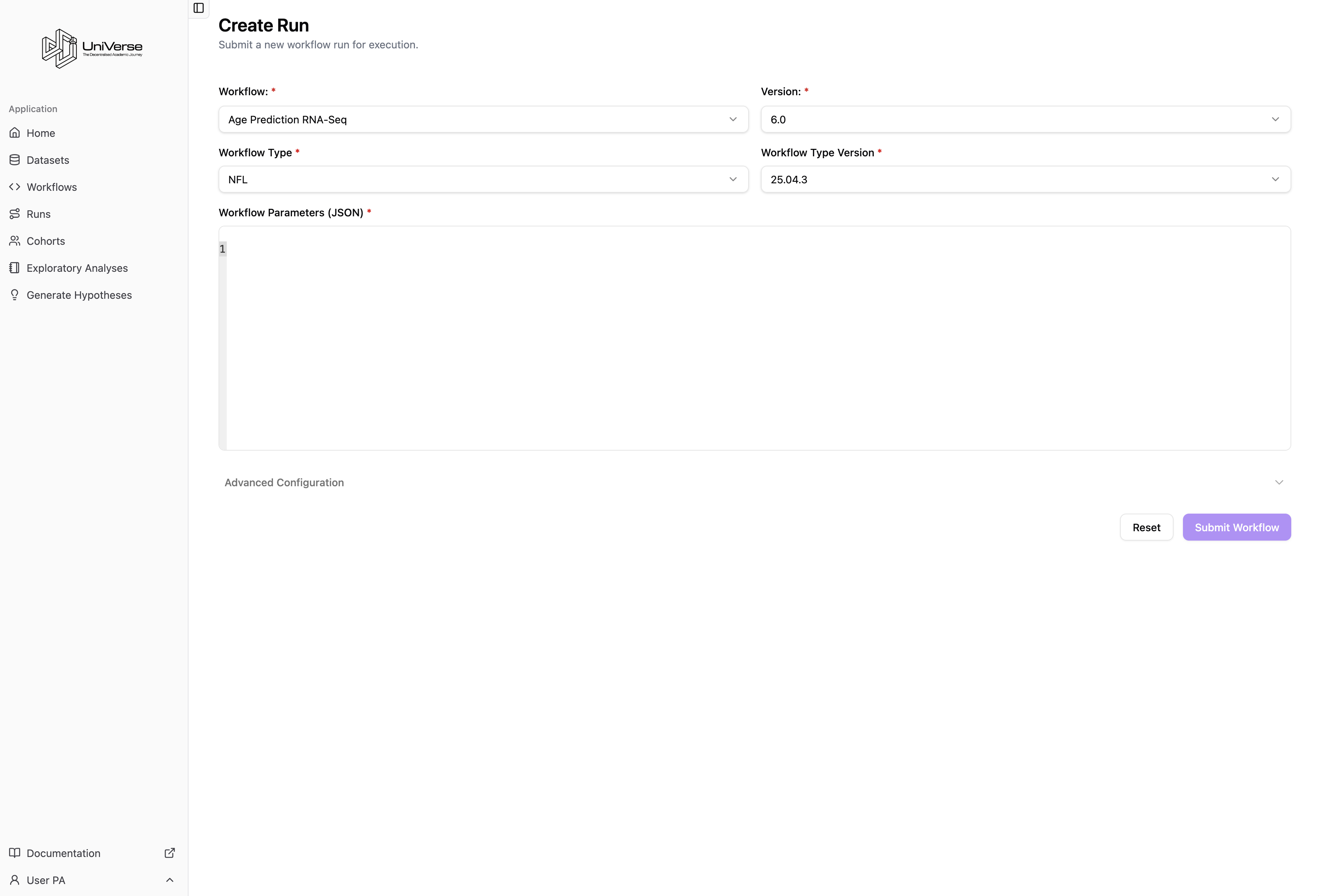 Start by selecting the workflow you wish to use. The dropdown will show the workflows available to you. When you select a workflow, if there is one version available, it will be selected for you.