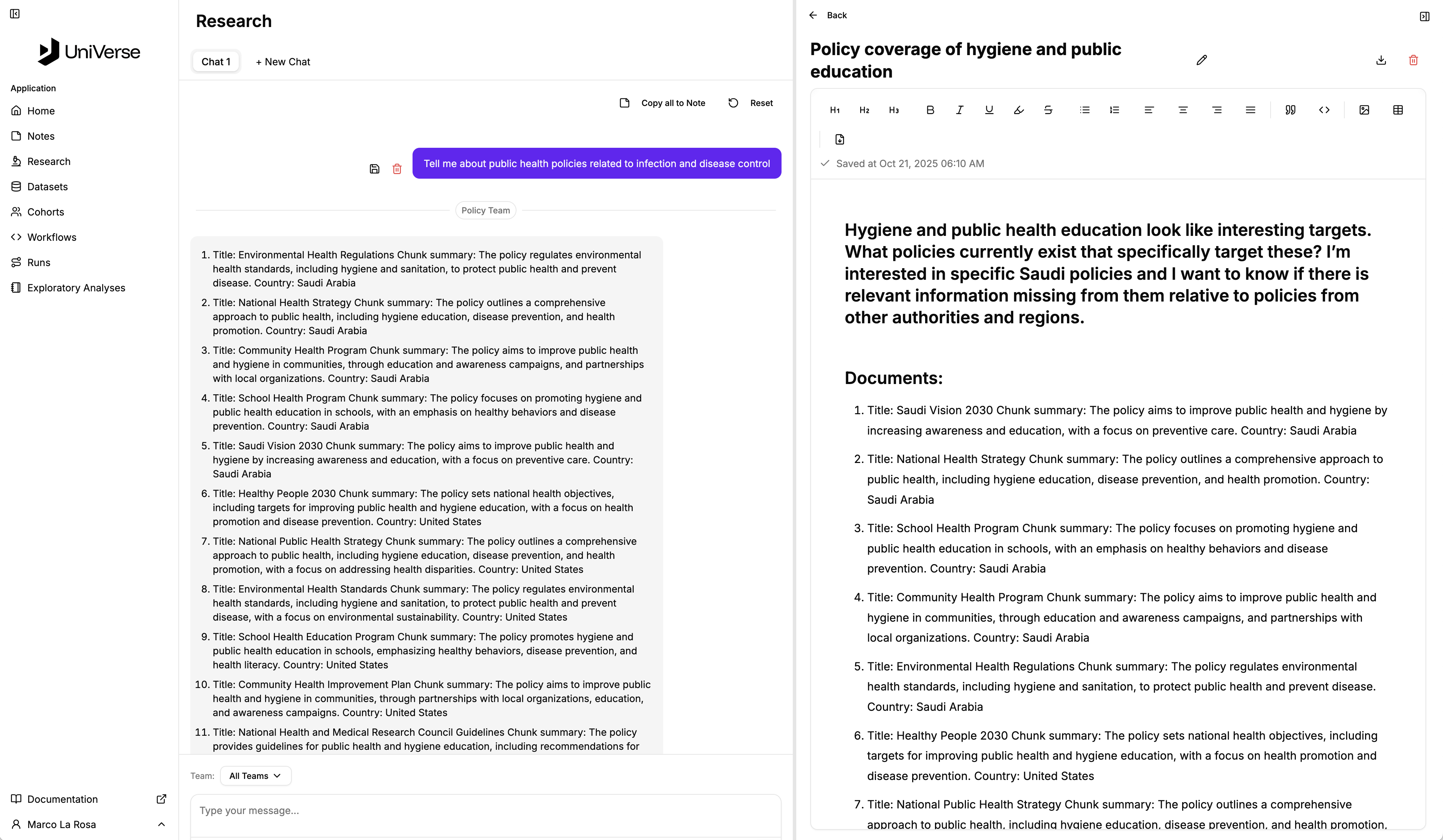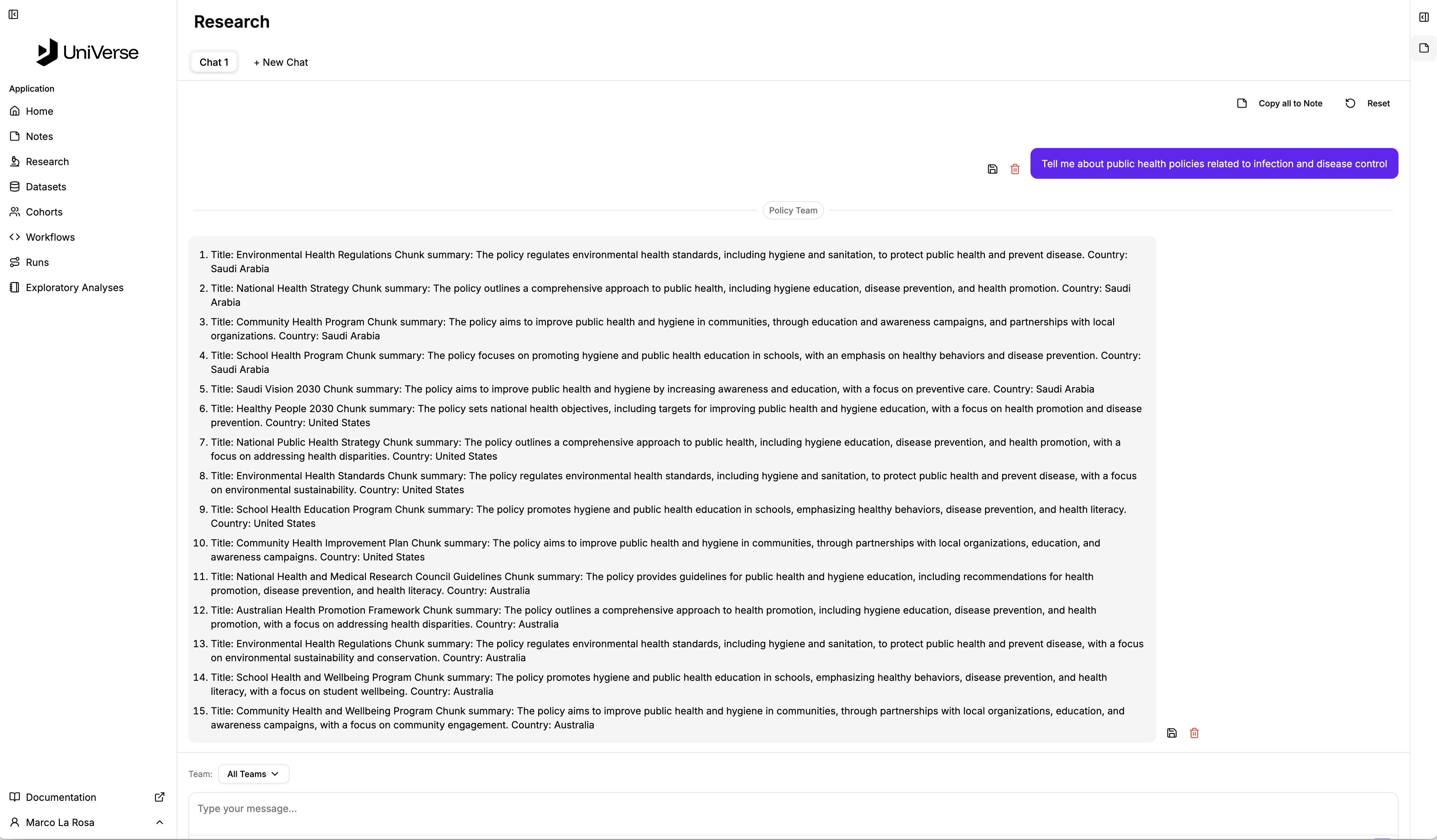 The research module puts the assistant and agentic teams front and center. In this section you have the ability to engage in one or many conversations to explore ideas and test hypotheses.