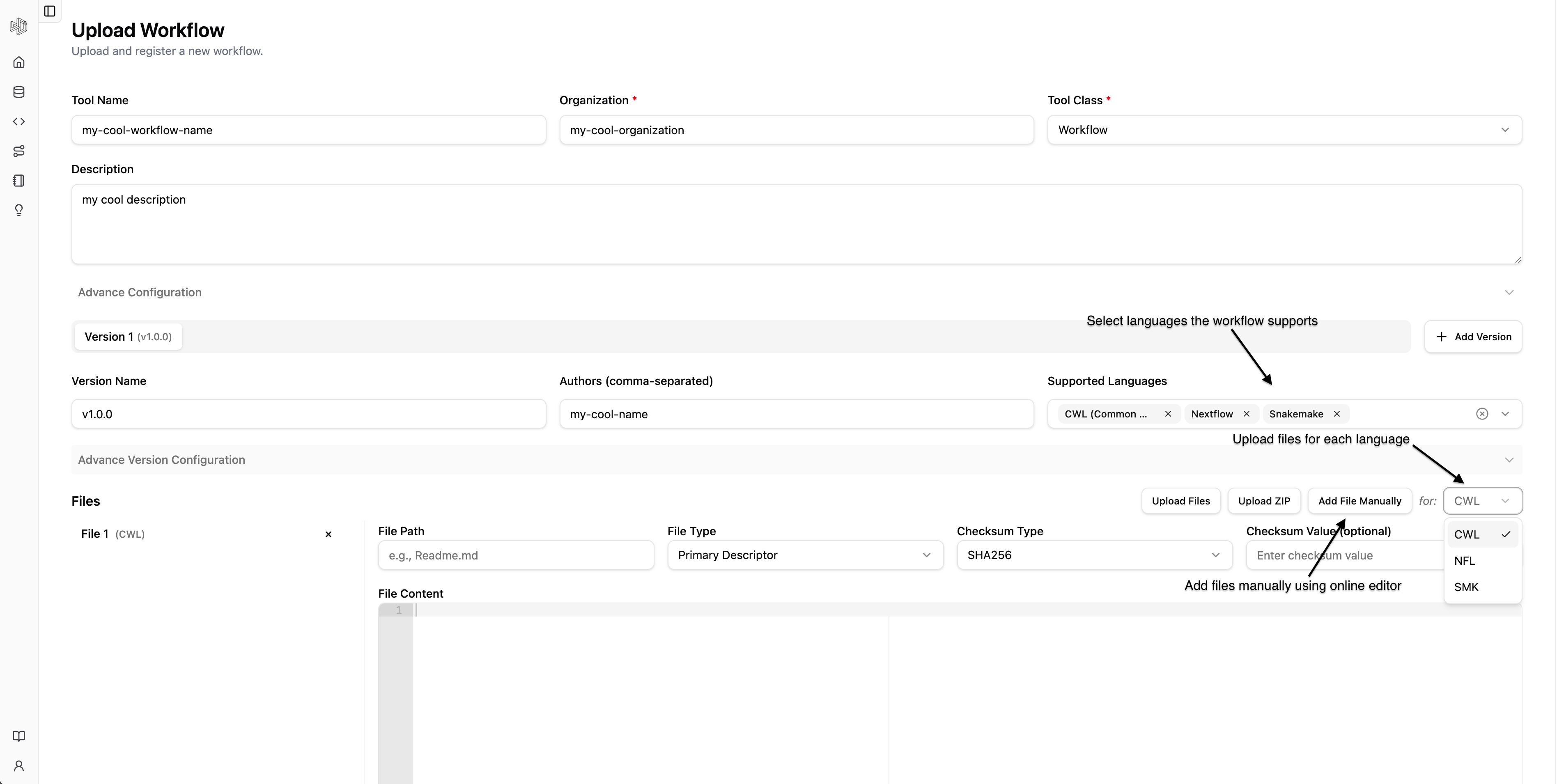 The following image shows the form for uploading a workflow. The basic overview is as follows: